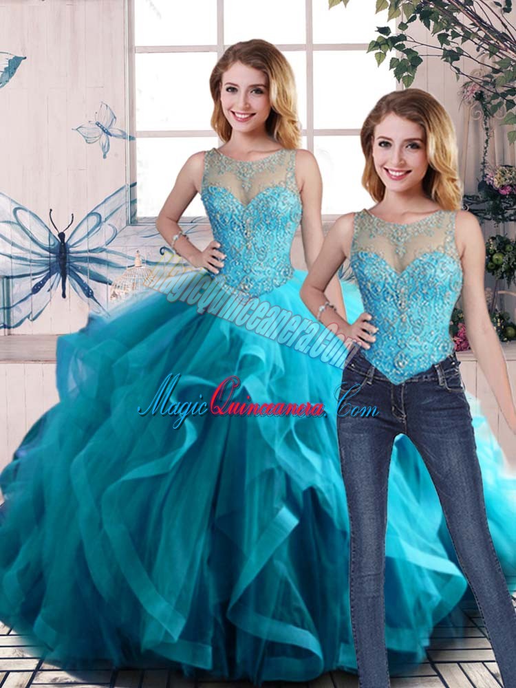 , Scoop Sleeveless Lace Up Sweet 16 Dresses Aqua Blue Tulle