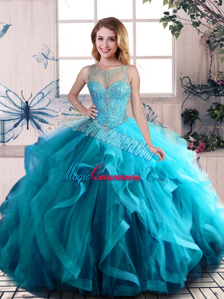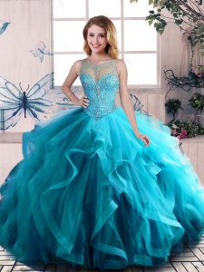 Scoop Sleeveless Lace Up Sweet 16 Dresses Aqua Blue Tulle