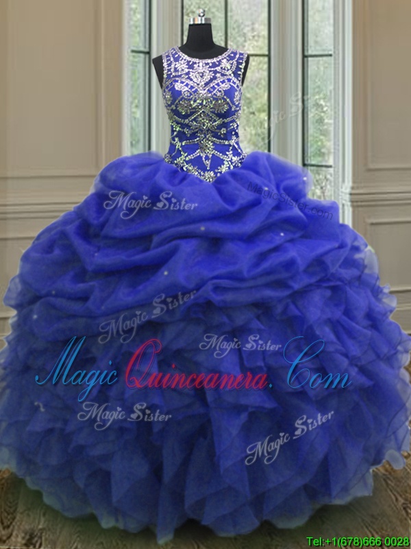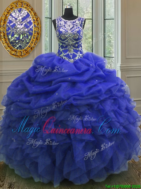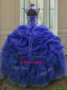 Scoop Sleeveless Organza Floor Length Lace Up Quinceanera Gowns in Royal Blue for with Beading and Ruffles and Pick Ups