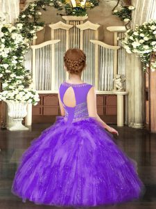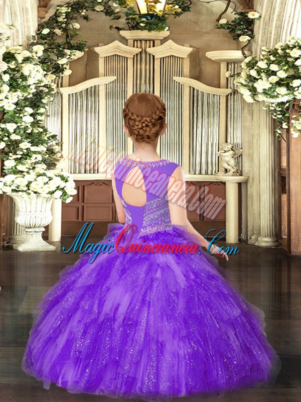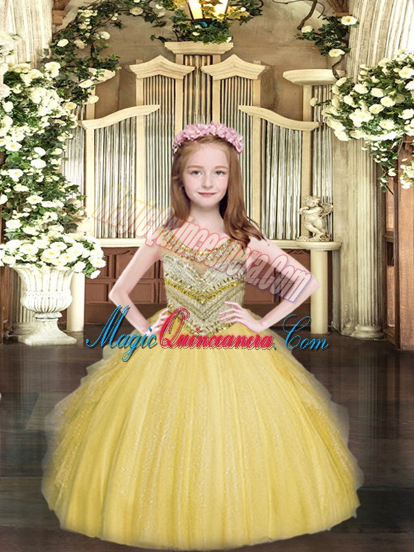 , Scoop Sleeveless Pageant Gowns Floor Length Beading and Ruffles Gold Tulle