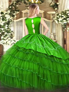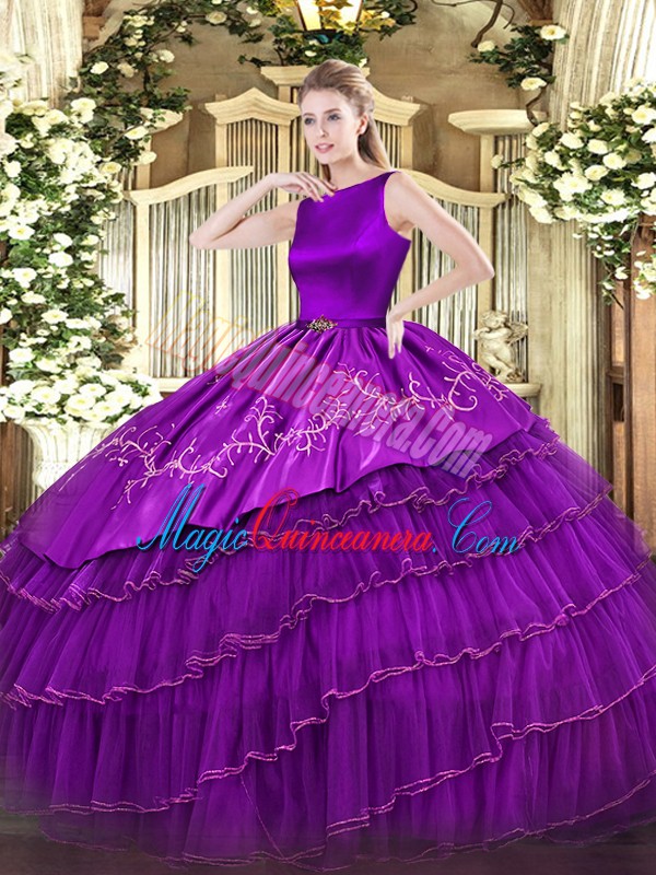 Scoop Sleeveless Quince Ball Gowns Floor Length Embroidery and Ruffled Layers Purple Organza
