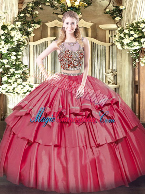 Scoop Sleeveless Quinceanera Dress Floor Length Beading and Ruffled Layers Coral Red Organza and Taffeta