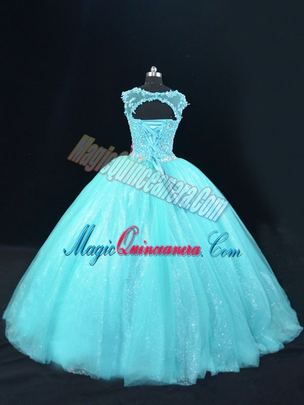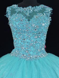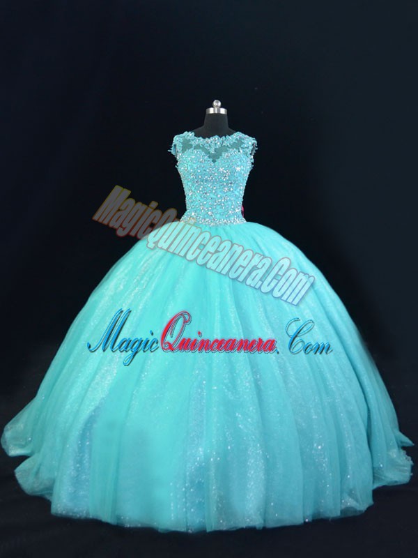 , Scoop Sleeveless Tulle Quinceanera Gowns Beading and Lace Lace Up