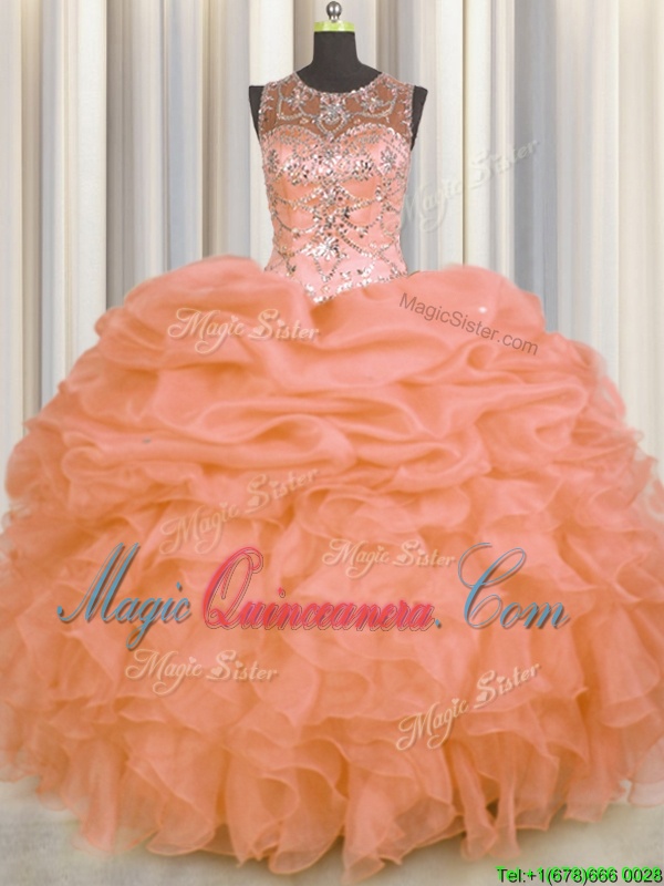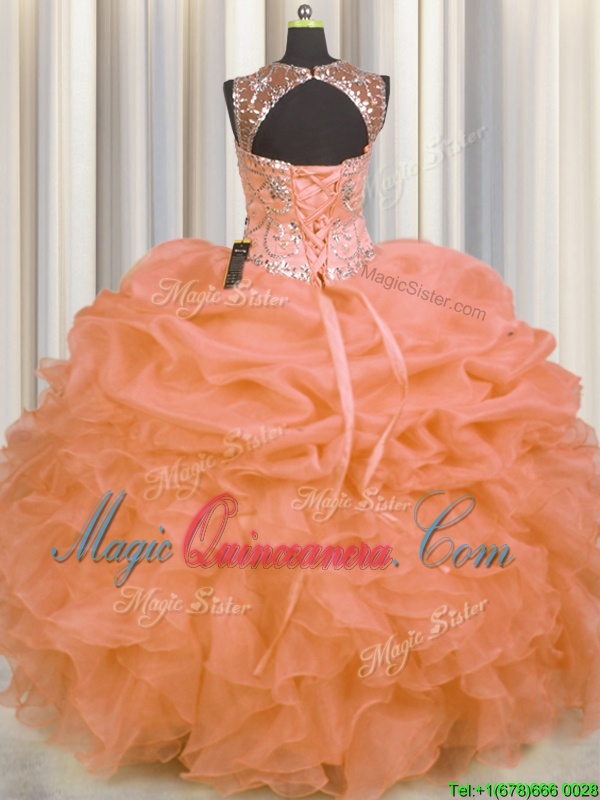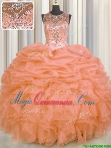 See Through Orange Sleeveless Floor Length Beading and Ruffles and Pick Ups Lace Up 15 Quinceanera Dress