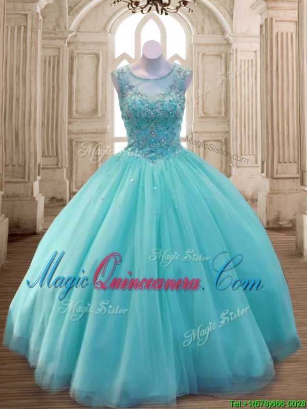 See Through Scoop Aqua Blue Quinceanera Dress with Beading for Spring