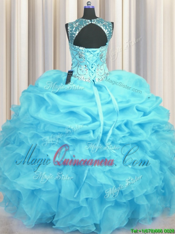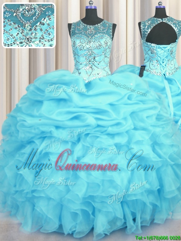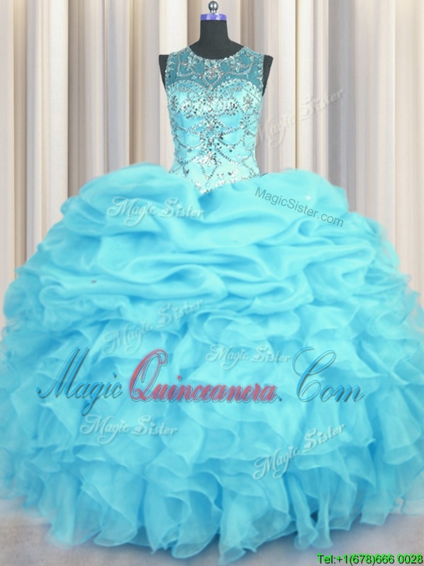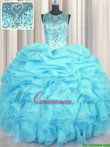 See Through Scoop Sleeveless Quinceanera Dress Floor Length Beading and Ruffles and Pick Ups Aqua Blue Organza