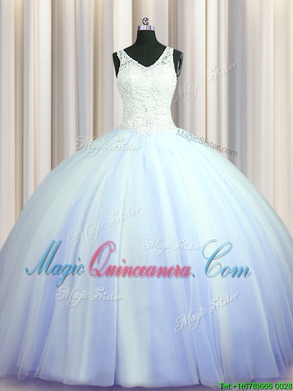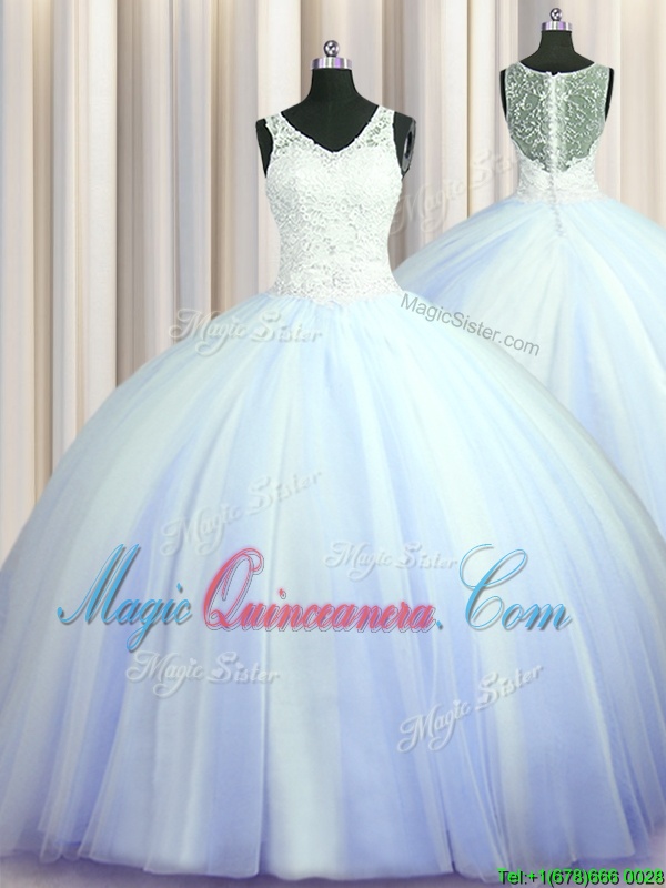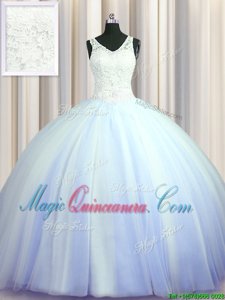 Fine See Through Zipple Up Quinceanera Gown V-neck Sleeveless Brush Train Zipper