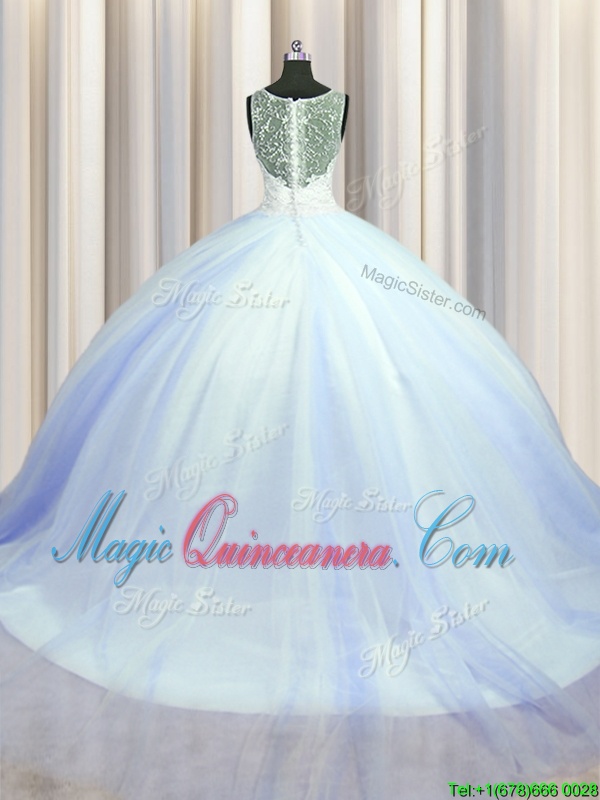 See Through Zipper Up Sleeveless Tulle With Brush Train Zipper Ball Gown Prom Dress in Baby Blue for with Beading and Appliques