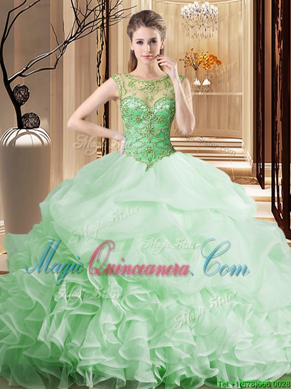 Sexy Apple Green Ball Gowns Organza Scoop Sleeveless Beading and Ruffles and Pick Ups Lace Up 15 Quinceanera Dress Brush Train