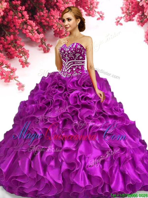 Sexy Fuchsia Ball Gowns Beading and Ruffles 15 Quinceanera Dress Lace Up Organza Sleeveless Floor Length