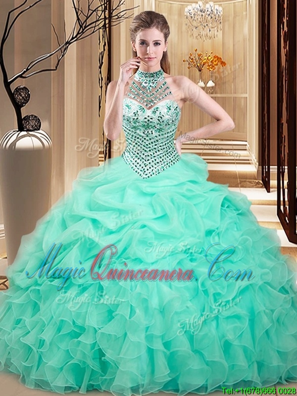 Sexy Halter Top Sleeveless Organza Floor Length Lace Up Quince Ball Gowns in Apple Green for with Beading and Ruffles and Pick Ups