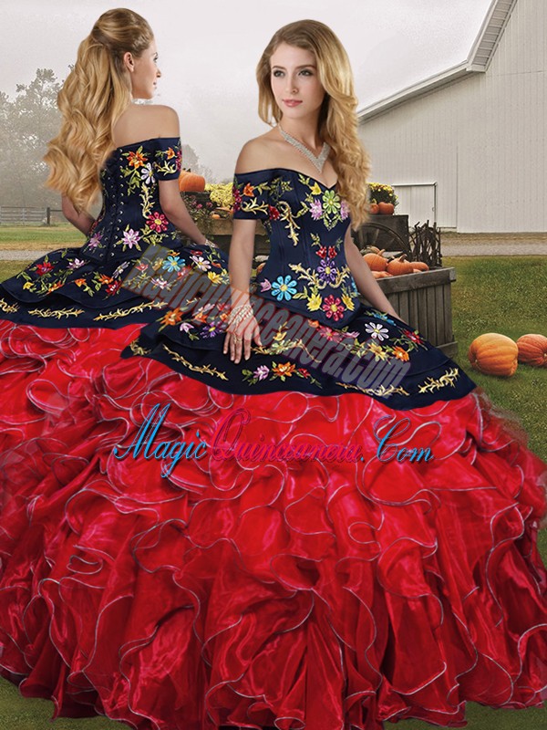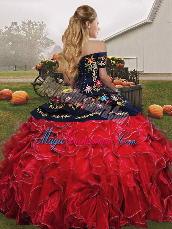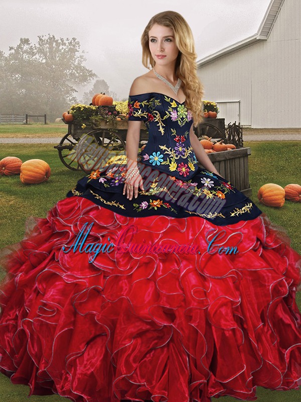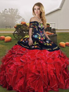 Sexy Sleeveless Floor Length Embroidery and Ruffles Lace Up Sweet 16 Quinceanera Dress with Red And Black