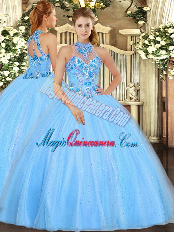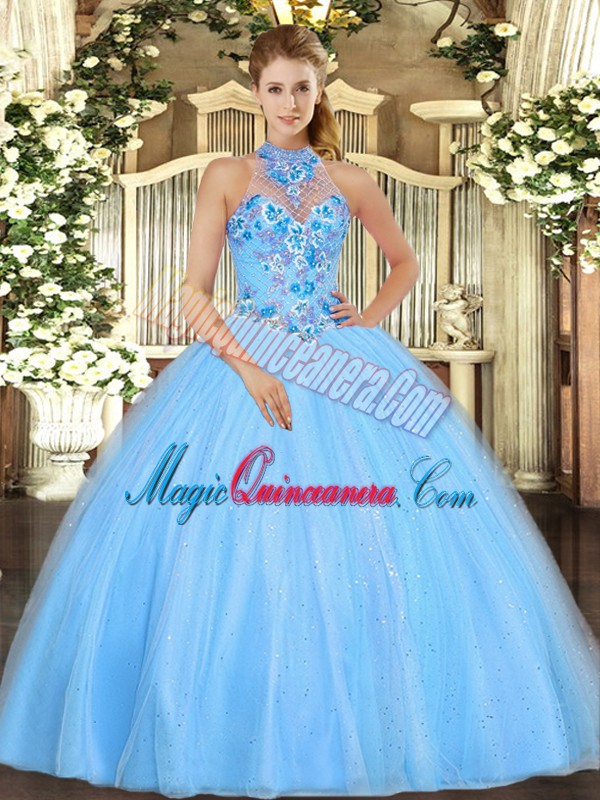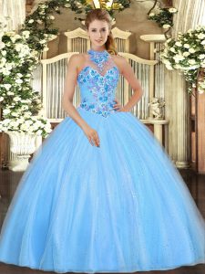 , Sexy Sleeveless Floor Length Embroidery Lace Up Quinceanera Gowns with Baby Blue