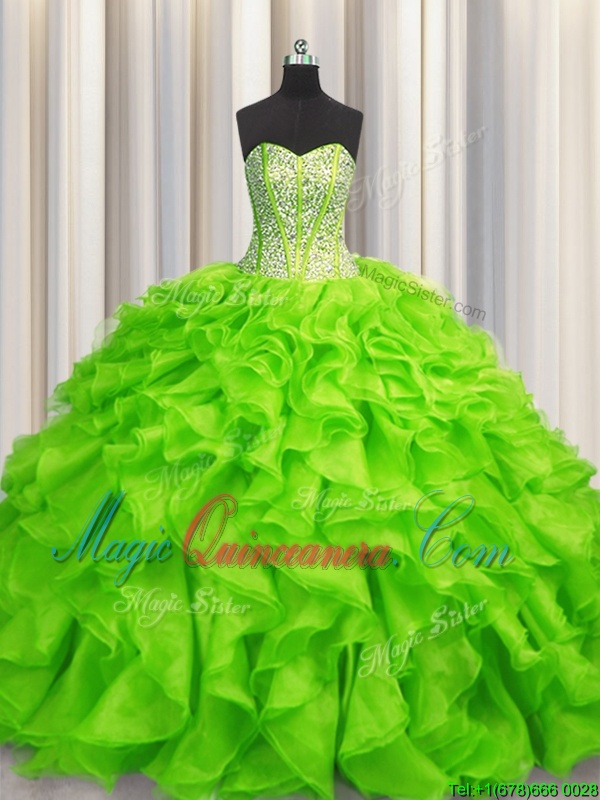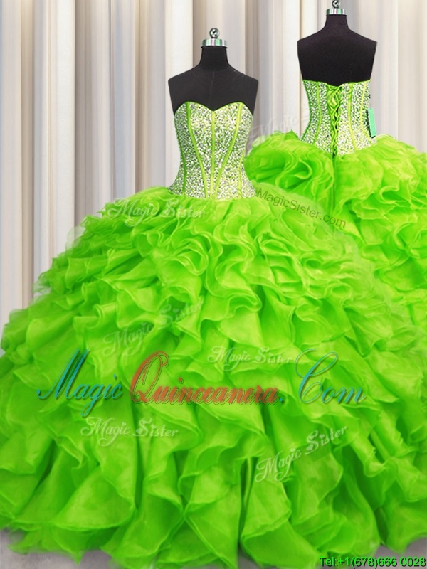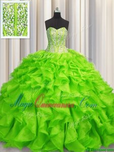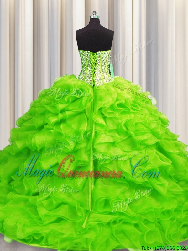 Visible Boning Organza Sleeveless Floor Length 15 Quinceanera Dress and Beading and Ruffles
