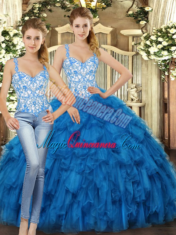 Shining Blue Ball Gowns Organza Straps Sleeveless Beading and Ruffles Floor Length Lace Up Quinceanera Dresses