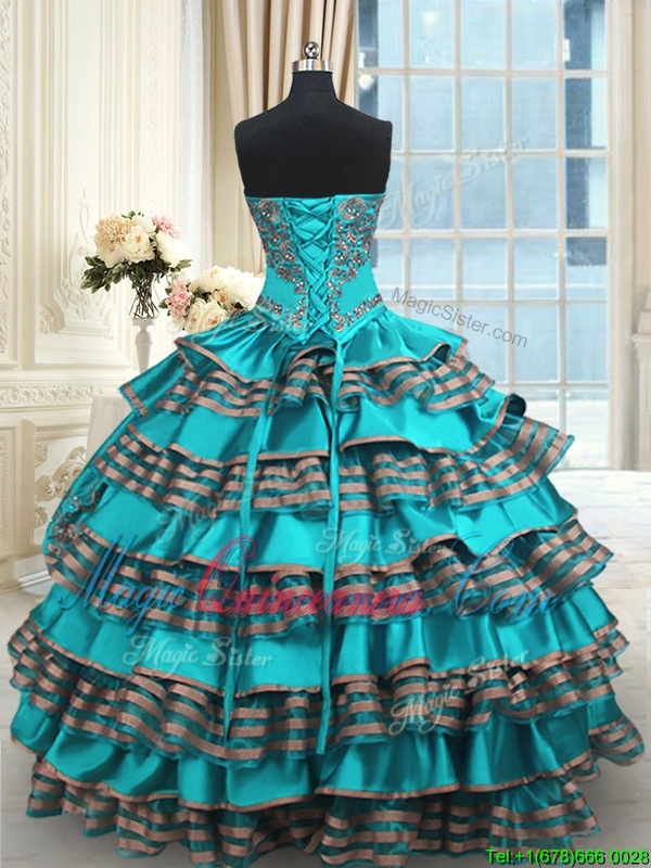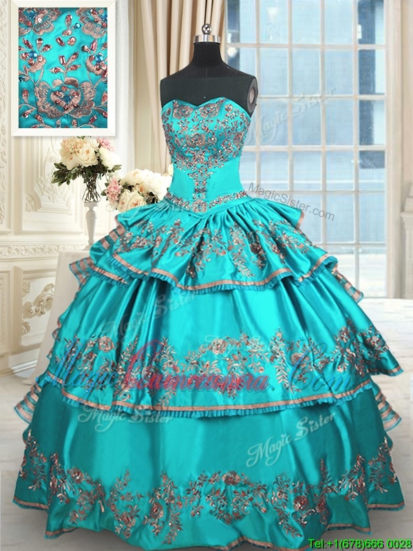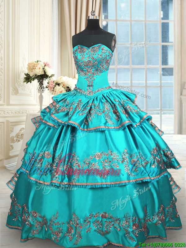 Shining Floor Length Aqua Blue Sweet 16 Dress Taffeta Sleeveless Embroidery and Ruffled Layers
