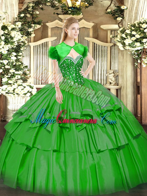 Shining Green Sweet 16 Dresses Military Ball and Sweet 16 and Quinceanera with Beading and Ruffled Layers Sweetheart Sleeveless Lace Up