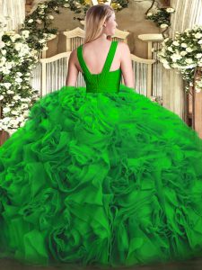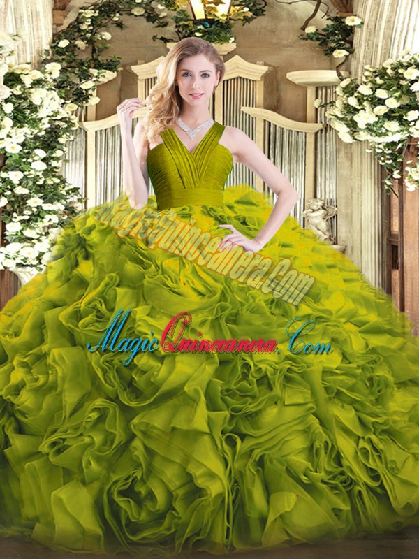 Shining Olive Green Ball Gowns V-neck Sleeveless Fabric With Rolling Flowers Floor Length Zipper Ruffles Sweet 16 Quinceanera Dress