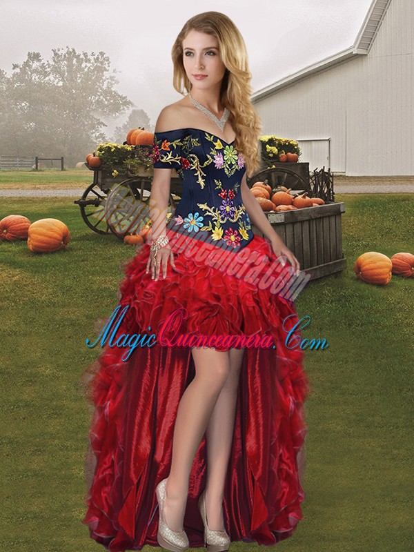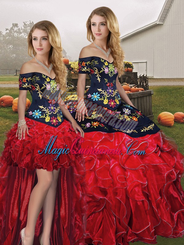 Shining Red And Black Three Pieces Organza Off The Shoulder Sleeveless Embroidery and Ruffles Floor Length Lace Up Quinceanera Gown