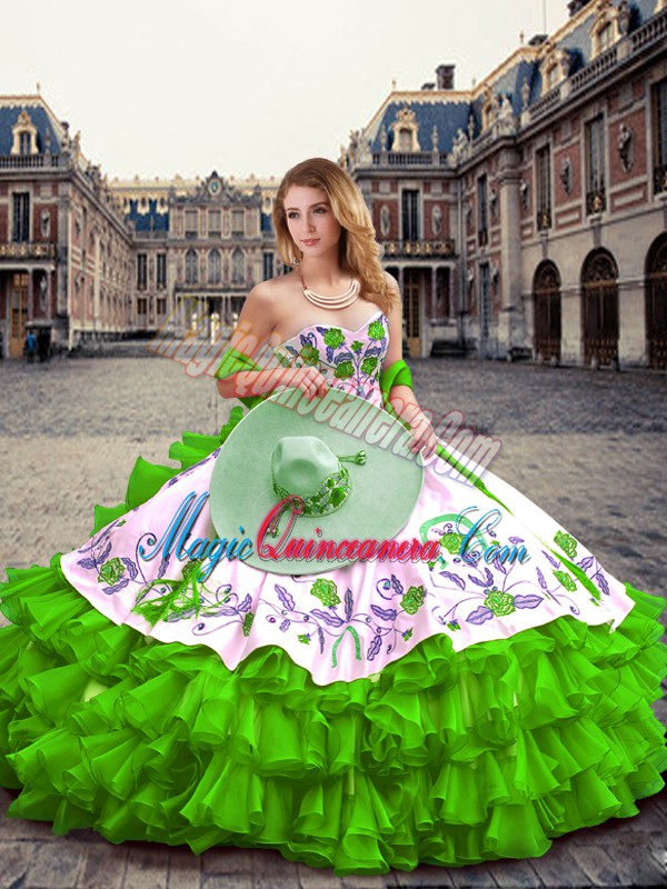 Shining Sleeveless Floor Length Embroidery and Ruffled Layers Lace Up Quinceanera Dresses with Green