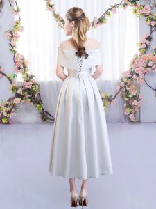 Silver Empire Satin Scoop Short Sleeves Appliques Tea Length Lace Up Quinceanera Court of Honor Dress