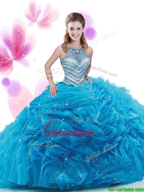 Simple Baby Blue Organza Zipper Sweet 16 Quinceanera Dress Sleeveless Court Train Ruffles - Magic Quinceanera