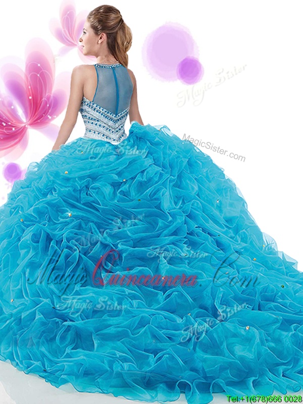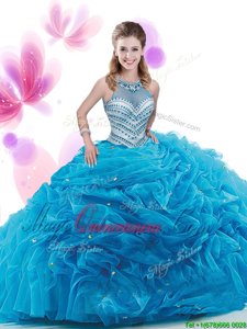 Simple Baby Blue Organza Zipper Sweet 16 Quinceanera Dress Sleeveless Court Train Ruffles