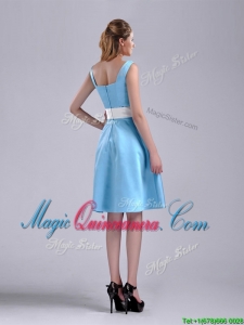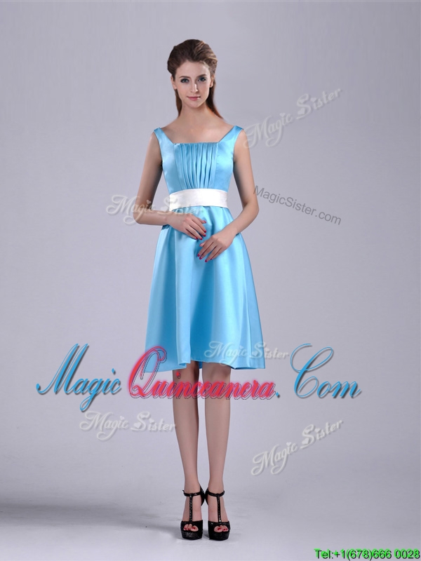 Simple Belted and Ruched Aqua Blue Dama Dress in Knee Length