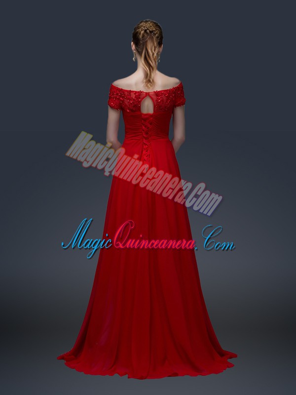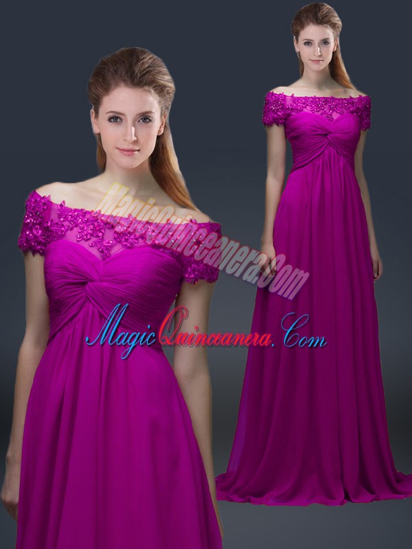 Simple Fuchsia Short Sleeves Appliques Floor Length Mother of Bride Dresses