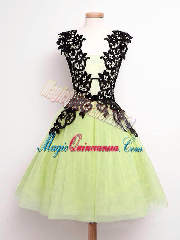 Simple Sleeveless Knee Length Lace Lace Up Vestidos de Damas with Yellow Green