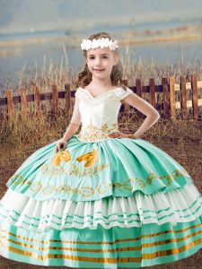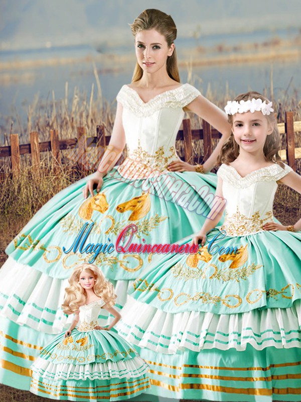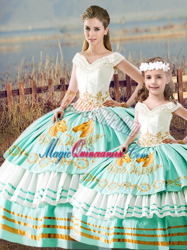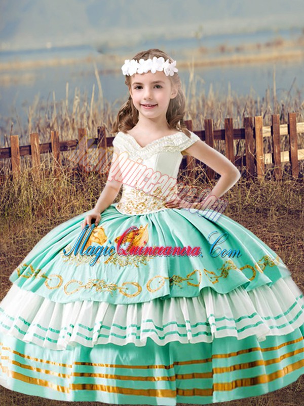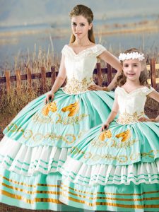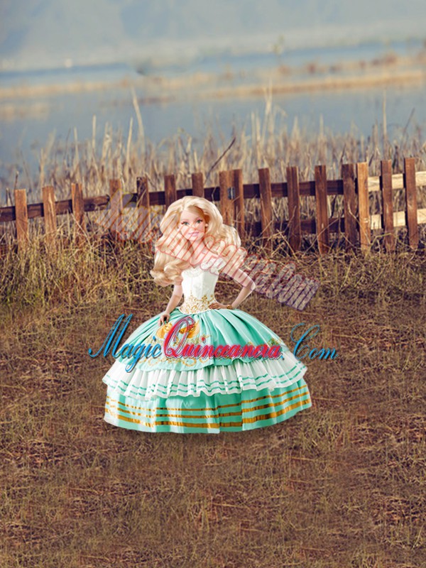 Simple Sleeveless Satin Floor Length Lace Up Vestidos de Quinceanera in Apple Green with Embroidery and Ruffled Layers