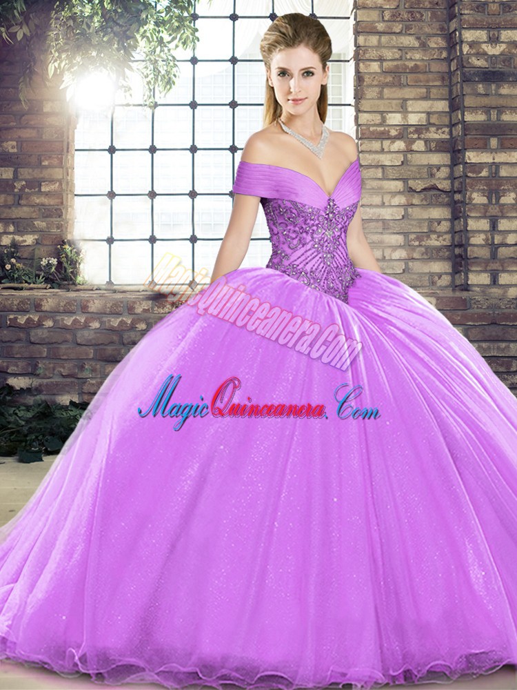Sleeveless Brush Train Beading Lace Up Quince Ball Gowns