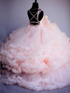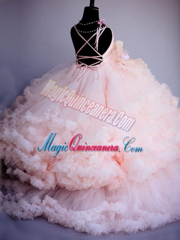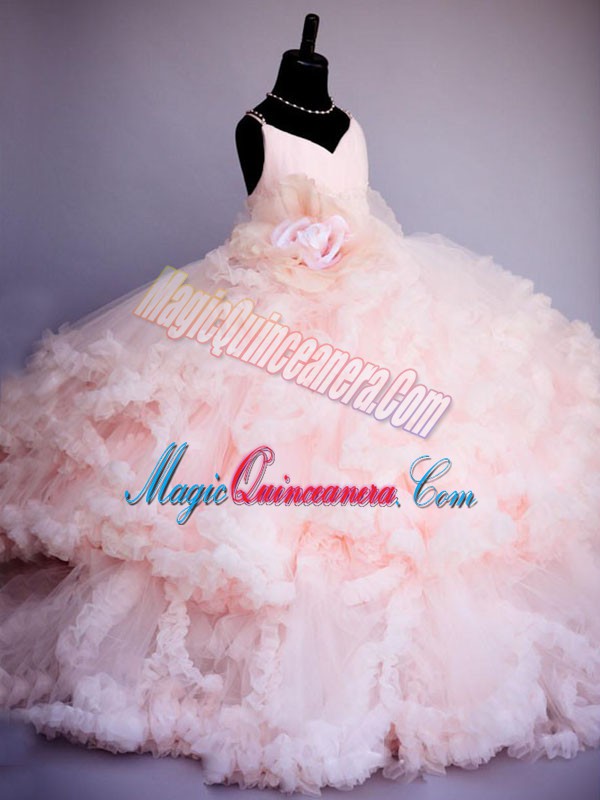 , Sleeveless Brush Train Criss Cross Ruffles and Hand Made Flower Pageant Gowns