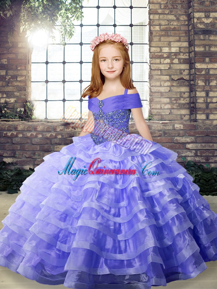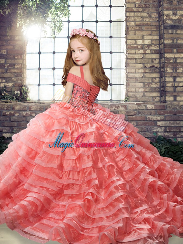 Sleeveless Brush Train Lace Up Beading and Ruffled Layers Little Girls Pageant Gowns