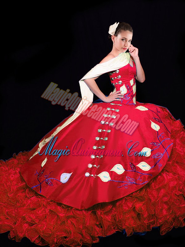, Sleeveless Embroidery and Ruffles Lace Up Quinceanera Dress with Red Brush Train