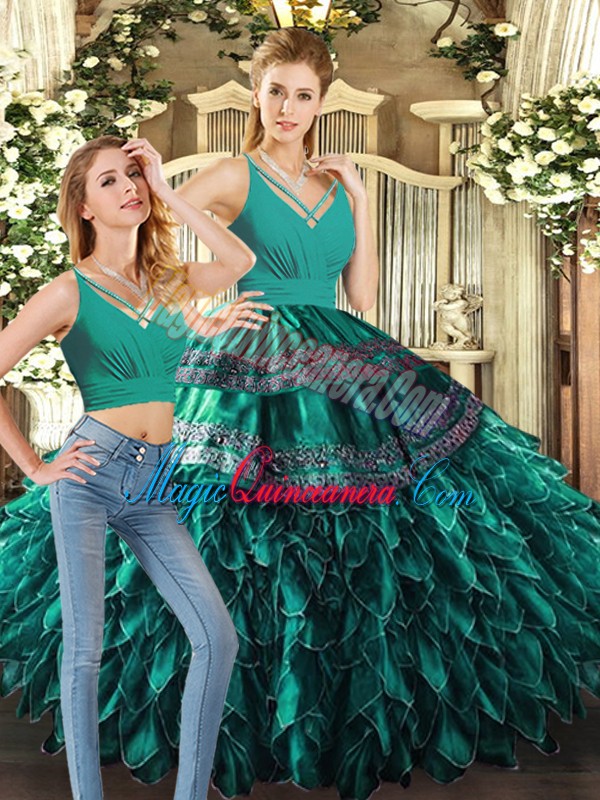 Sleeveless Floor Length Appliques and Ruffles Backless Quinceanera Gown with Turquoise