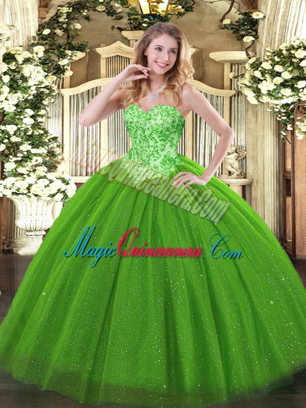 , Sleeveless Floor Length Appliques Lace Up Quince Ball Gowns with Green