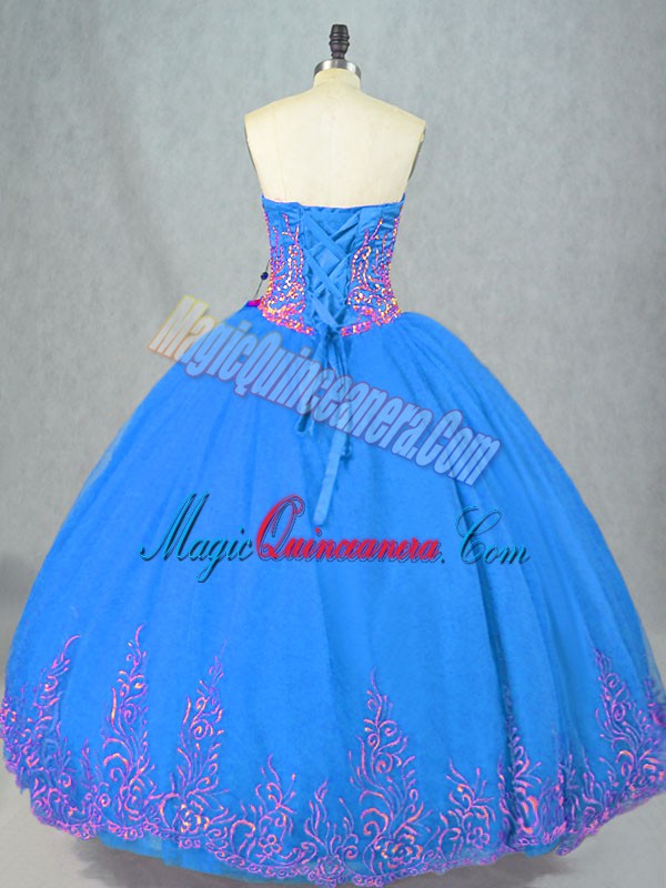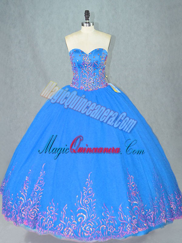 Sleeveless Floor Length Beading and Embroidery Lace Up 15th Birthday Dress with Blue