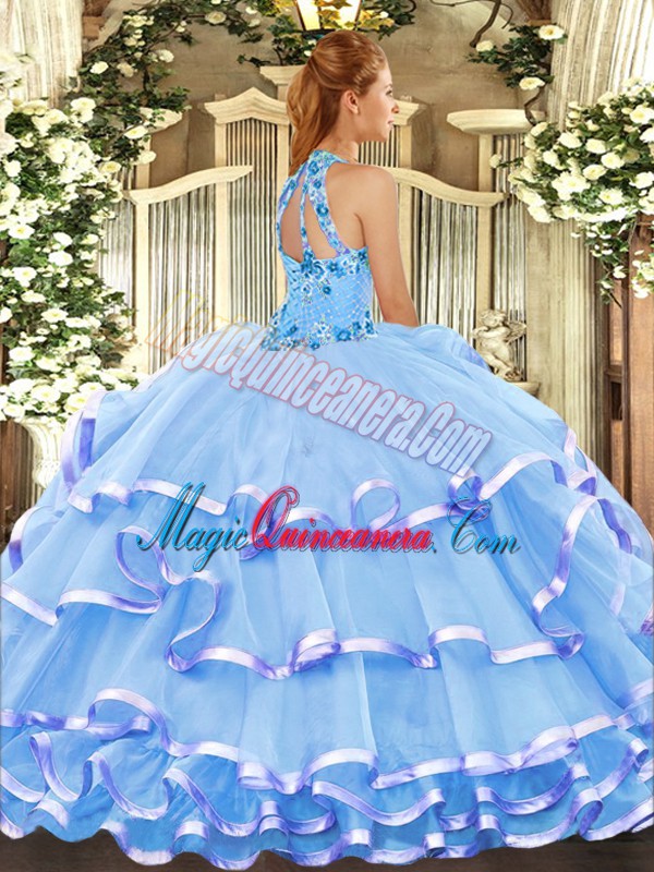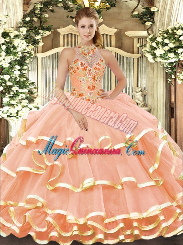 Sleeveless Floor Length Beading and Embroidery Lace Up Quinceanera Dress with Peach