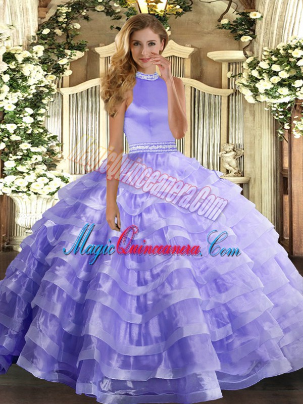 Sleeveless Floor Length Beading and Ruffled Layers Backless 15th Birthday Dress with Lavender