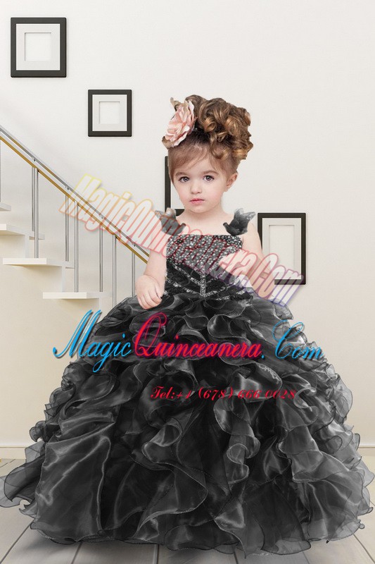 Sleeveless Floor Length Beading and Ruffles Lace Up Little Girl Pageant Gowns with Black