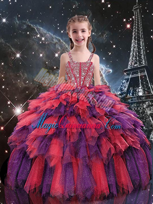 Sleeveless Floor Length Beading and Ruffles Lace Up Pageant Dress for Teens with Coral Red