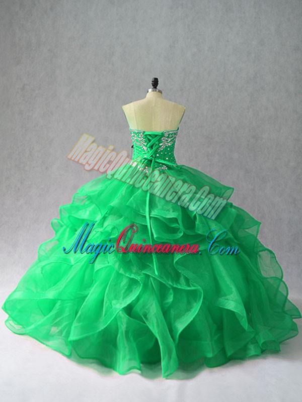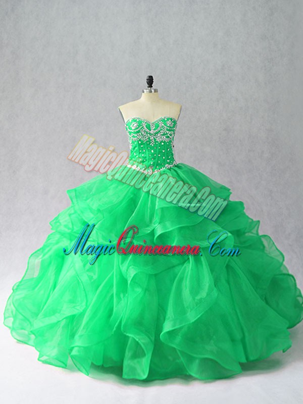 , Sleeveless Floor Length Beading and Ruffles Lace Up Quinceanera Dresses with Green