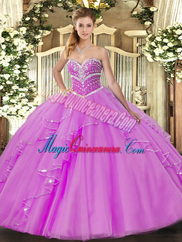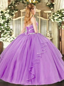 , Sleeveless Floor Length Beading and Ruffles Lace Up Quinceanera Gowns with Lilac