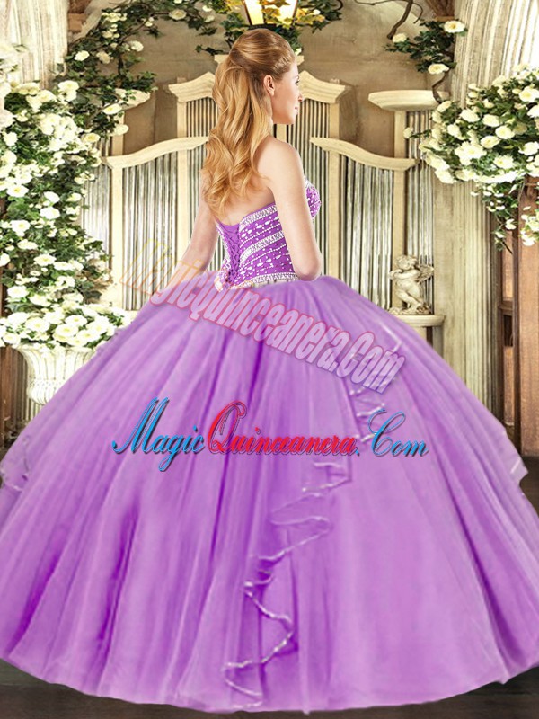 Sleeveless Floor Length Beading and Ruffles Lace Up Quinceanera Gowns with Lilac