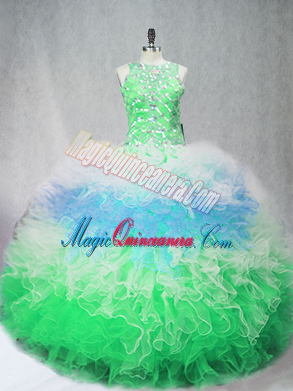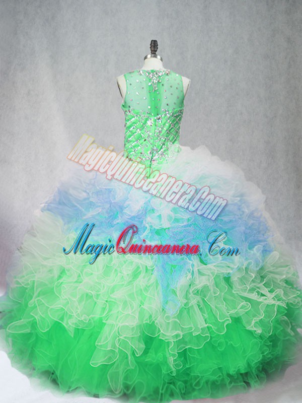 Sleeveless Floor Length Beading and Ruffles Zipper 15th Birthday Dress with Multi-color