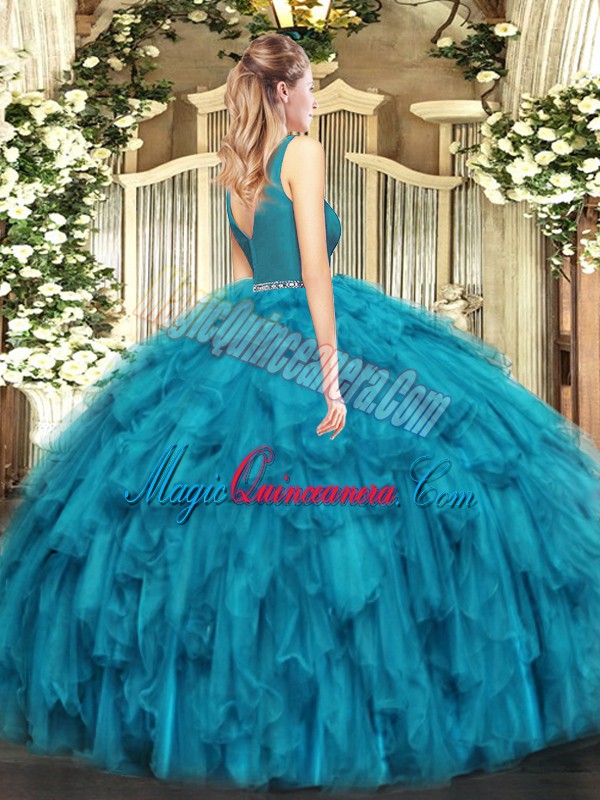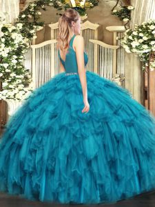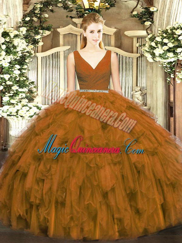 , Sleeveless Floor Length Beading and Ruffles Zipper Quinceanera Dresses with Brown