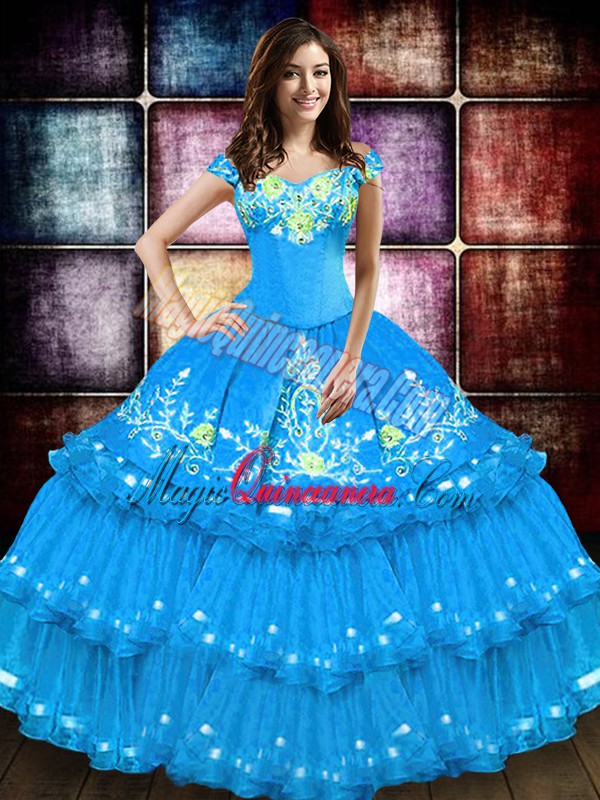 Sleeveless Floor Length Embroidery and Ruffled Layers Lace Up Quinceanera Dress with Baby Blue