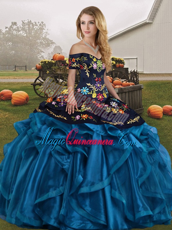 Sleeveless Floor Length Embroidery and Ruffles Lace Up 15th Birthday Dress with Blue And Black