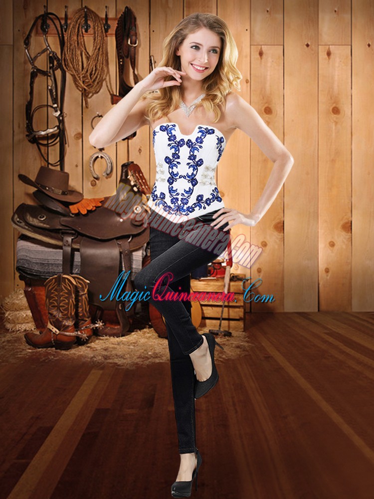 Sleeveless Floor Length Embroidery and Ruffles Lace Up Sweet 16 Quinceanera Dress with Blue And White